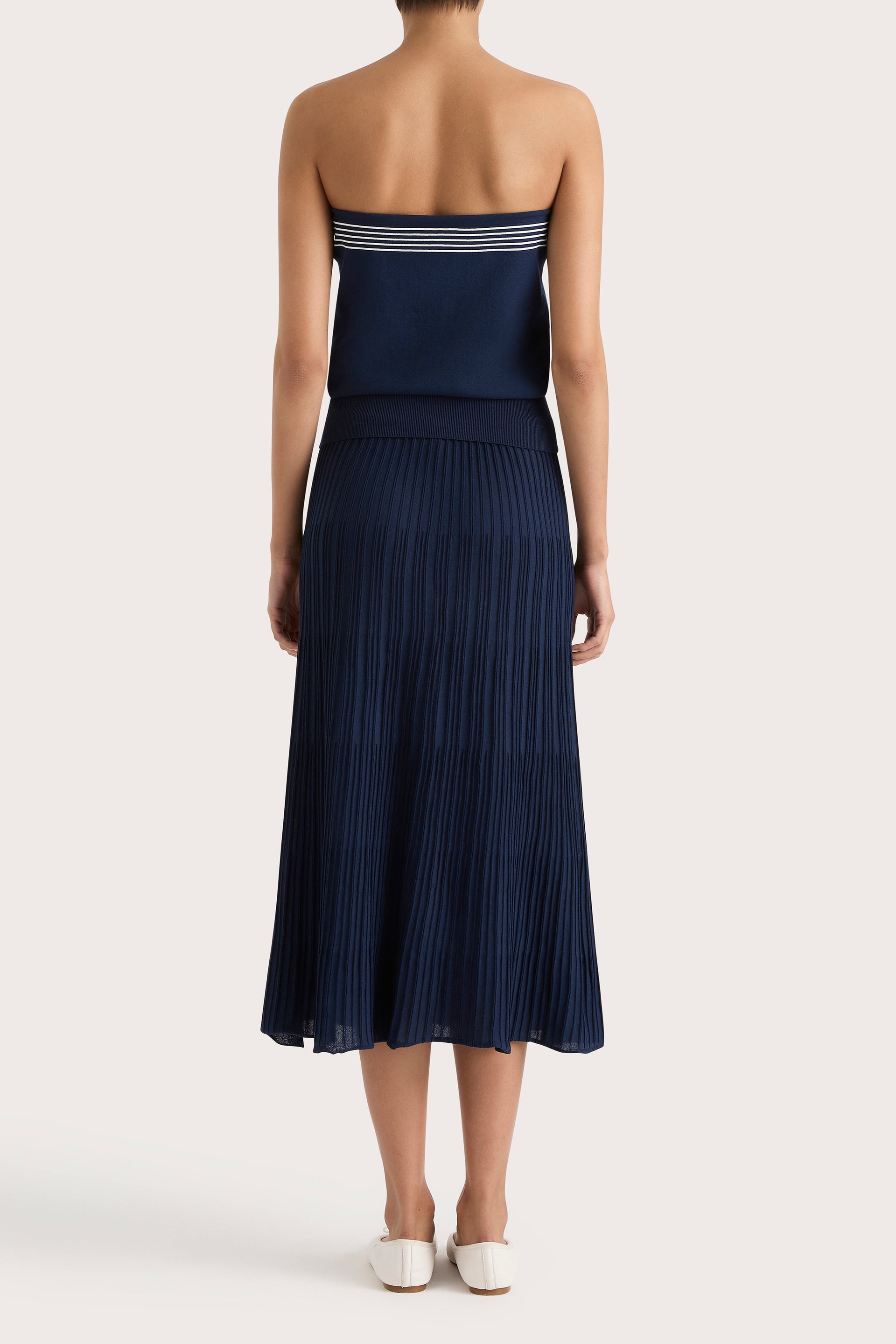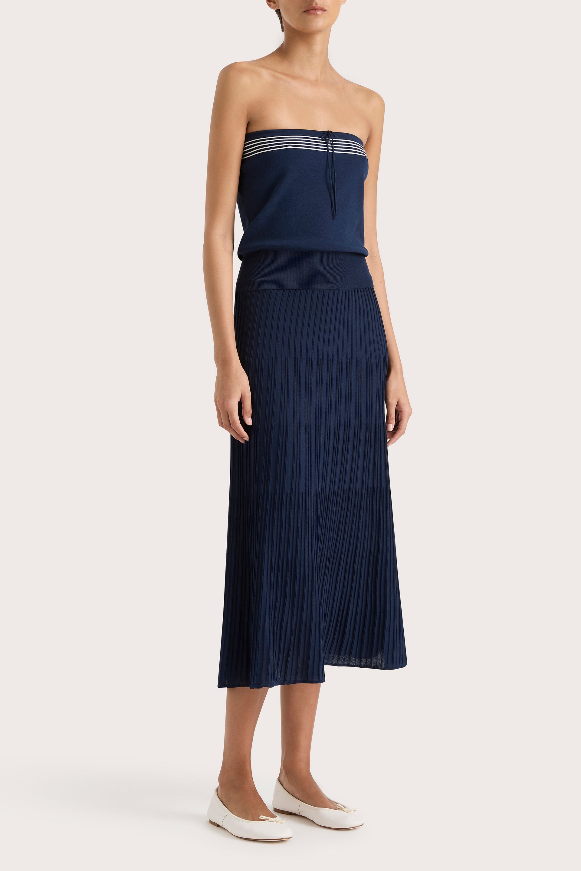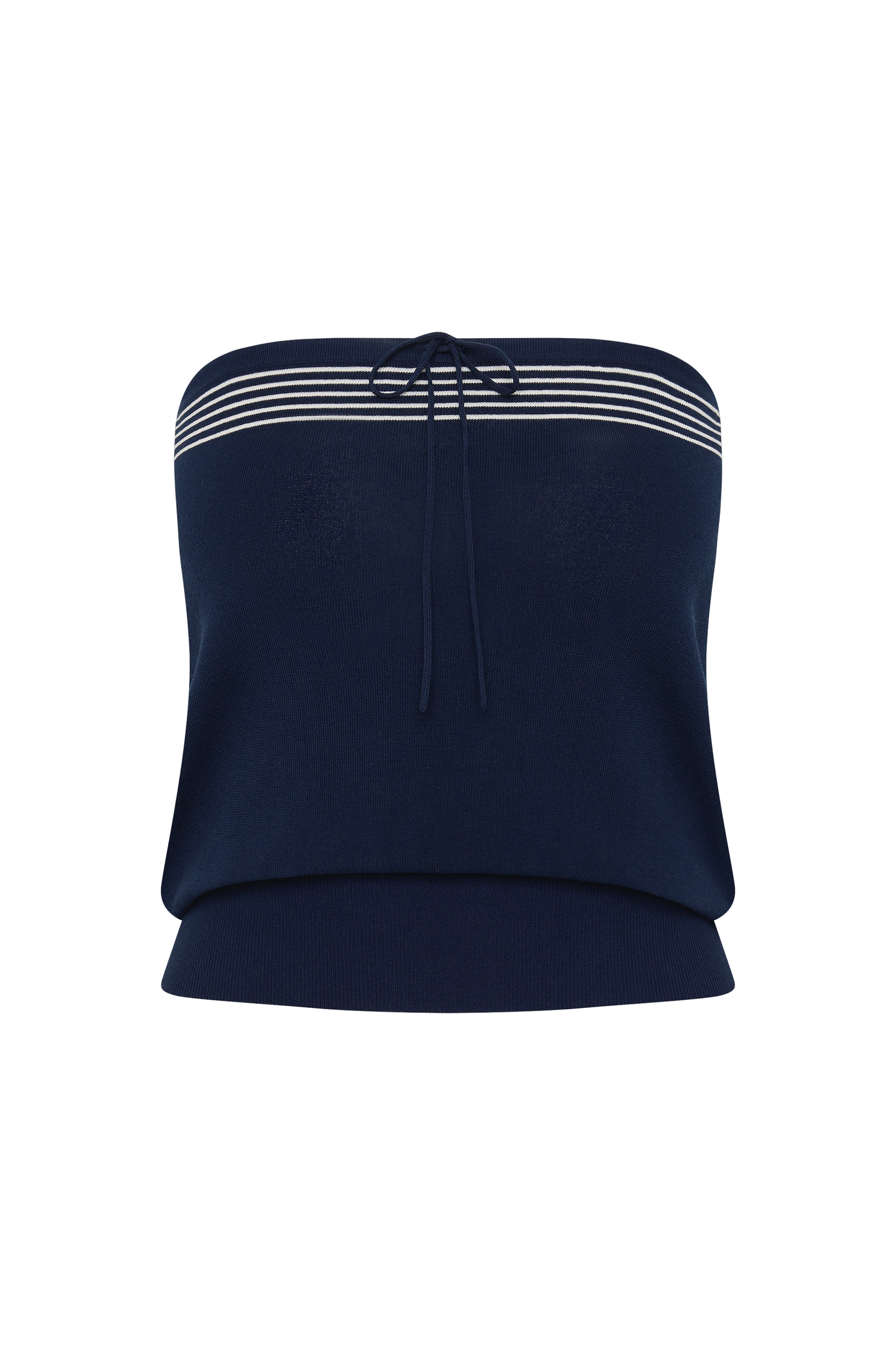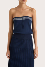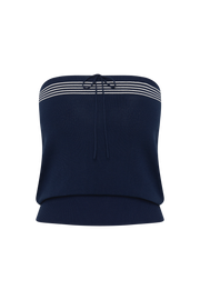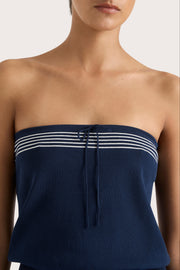A nautical-inspired strapless top, designed from an ultra soft blend of 100% organic cotton and nylon in a deep navy blue. Strapless with a straight neckline, it features three white stripes across the top of the bodice, a delicate tie detail and a wide elasticated waistband, ribbed in feel.