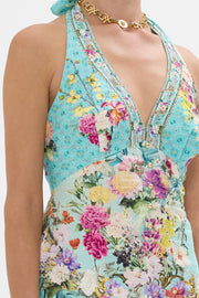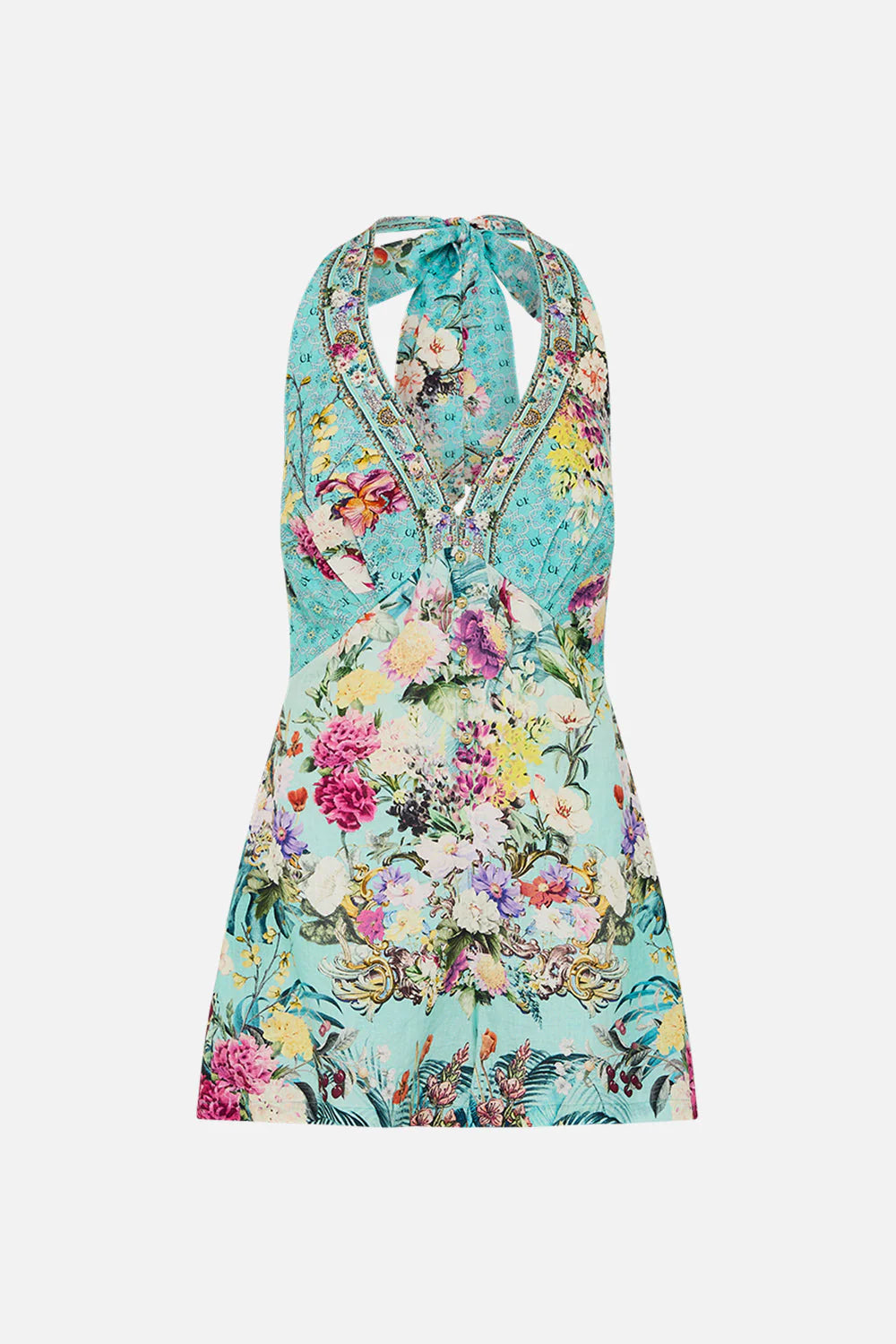 The Gardens Of Queluz Button Front Halter Playsuit invites you into Queluz Palace, where vivid greens and lush florals blend with the elegance of Azulejo tiles, celebrating nature and artful design. Lovingly handcrafted, this captivating CAMILLA playsuit features a deep V neckline, elegantly complemented by generous halter ties that offers a lavishly versatile touch. Crystal embellishments are thoughtfully placed to scintillate and catch the light and chic button detailing at the front further enhances the elegance of the playsuit. The open back detail creates an element of allure against sun-kissed skin.