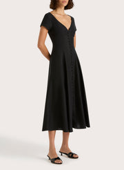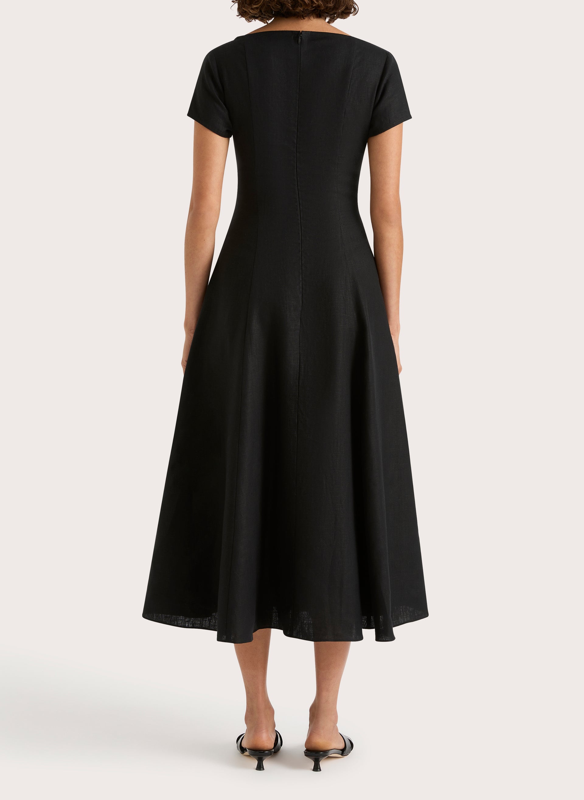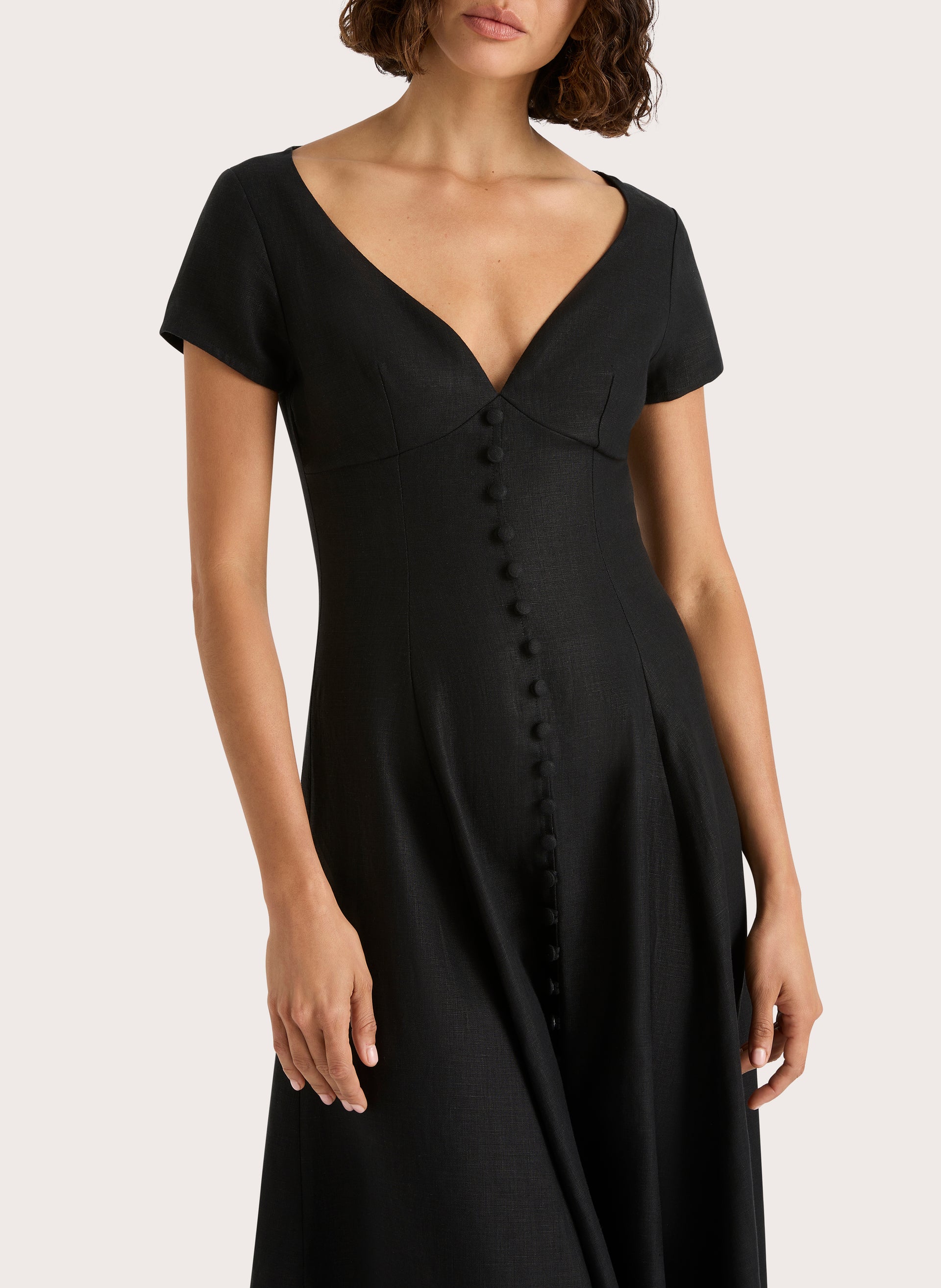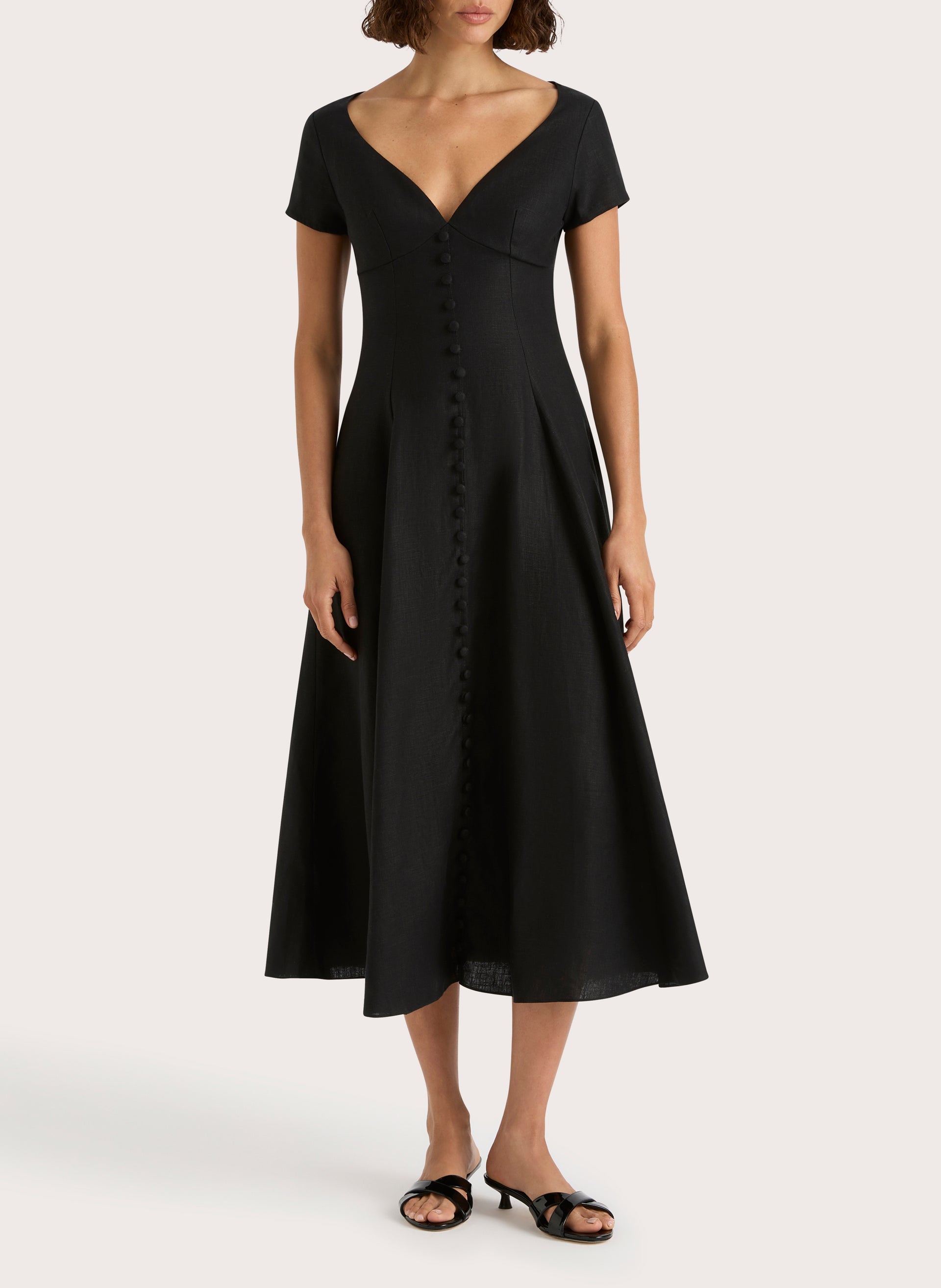 The Delphine Midi Dress by Faithful is made from certified linen fabric, ensuring both quality and sustainability. With a deep V neckline and flared hem, this midi dress is both elegant and versatile. Features cap sleeves, mock front buttons, and a convenient zip opening. Partially lined for maximum comfort.