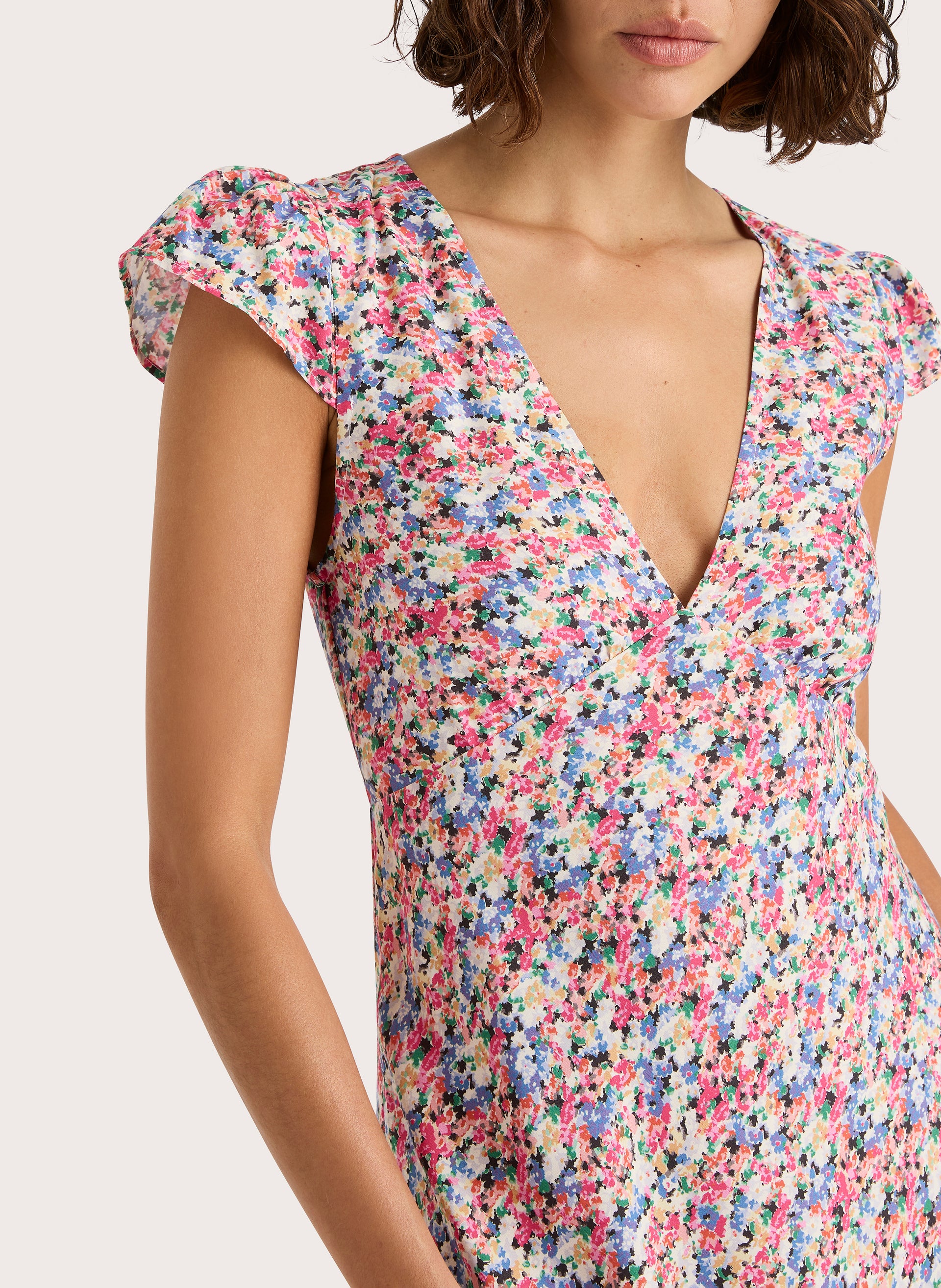 The Esson Midi Dress is made of soft rayon crepe fabric and features a flattering v-neck and elegant cap sleeves. The back waist tie and side zip opening add a touch of sophistication, while the a-line skirt creates a flattering silhouette. Perfect for any occasion, this unlined midi dress is a versatile addition to any wardrobe.