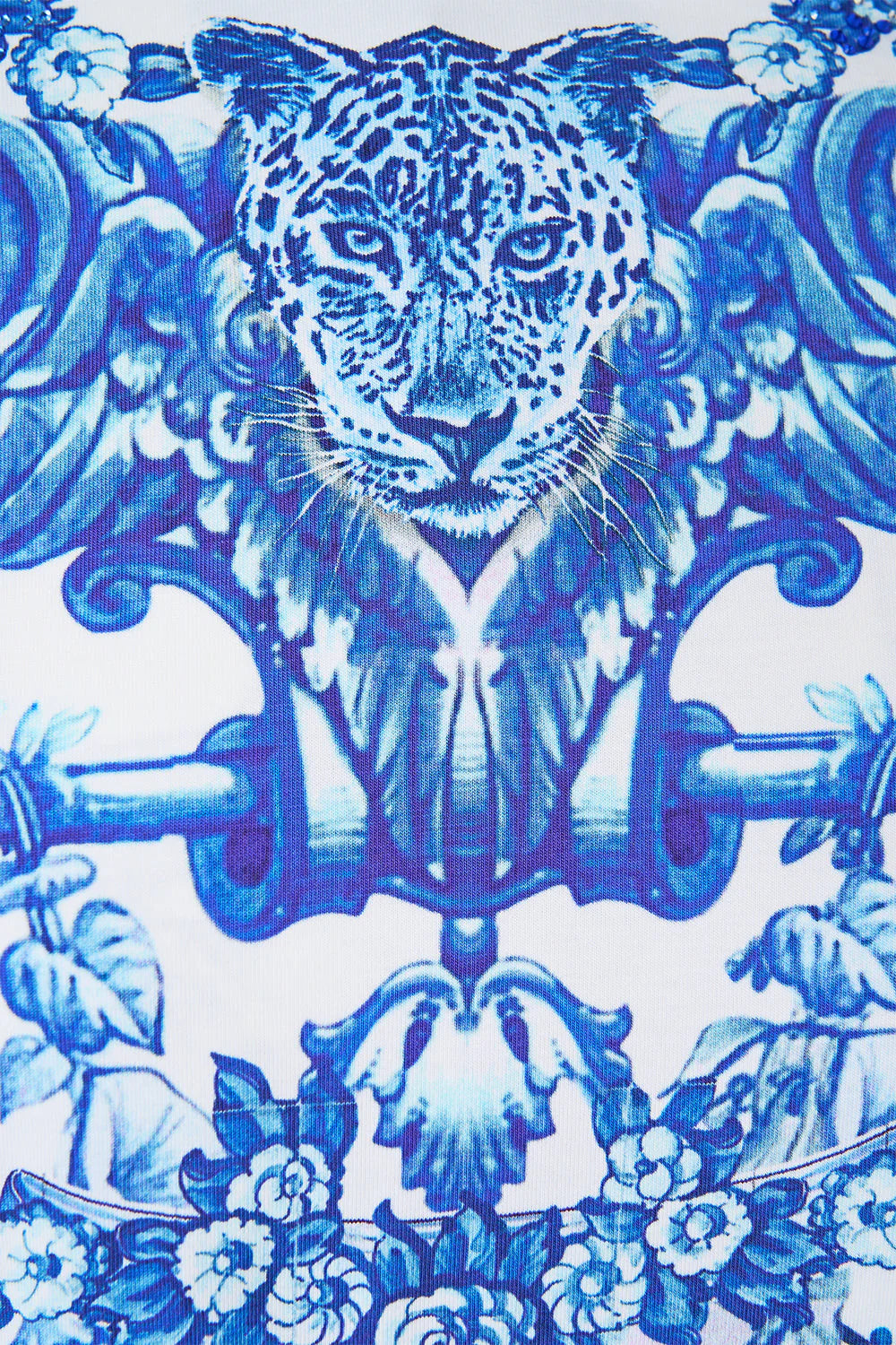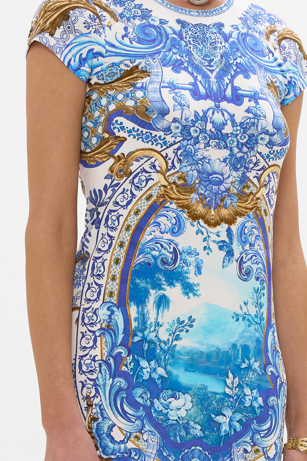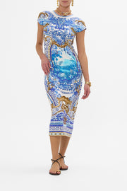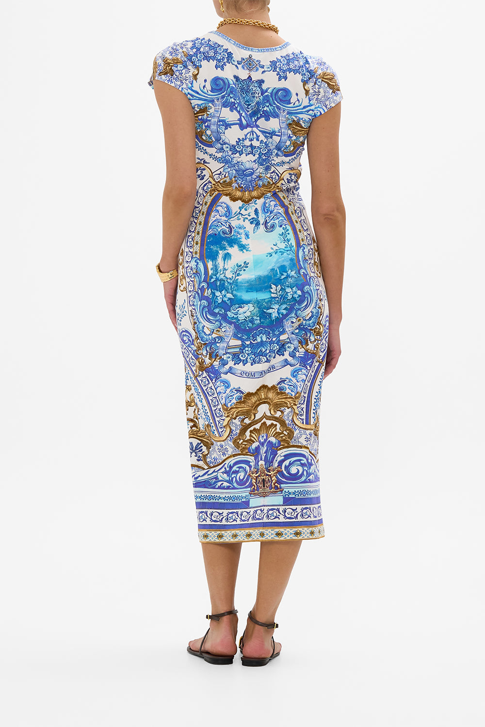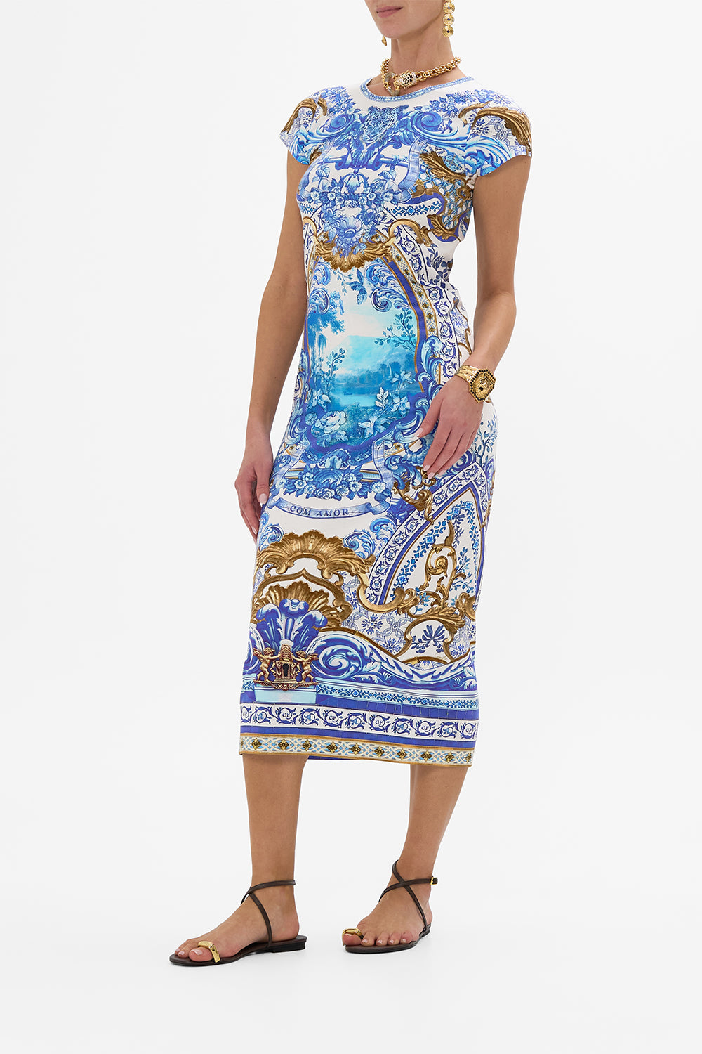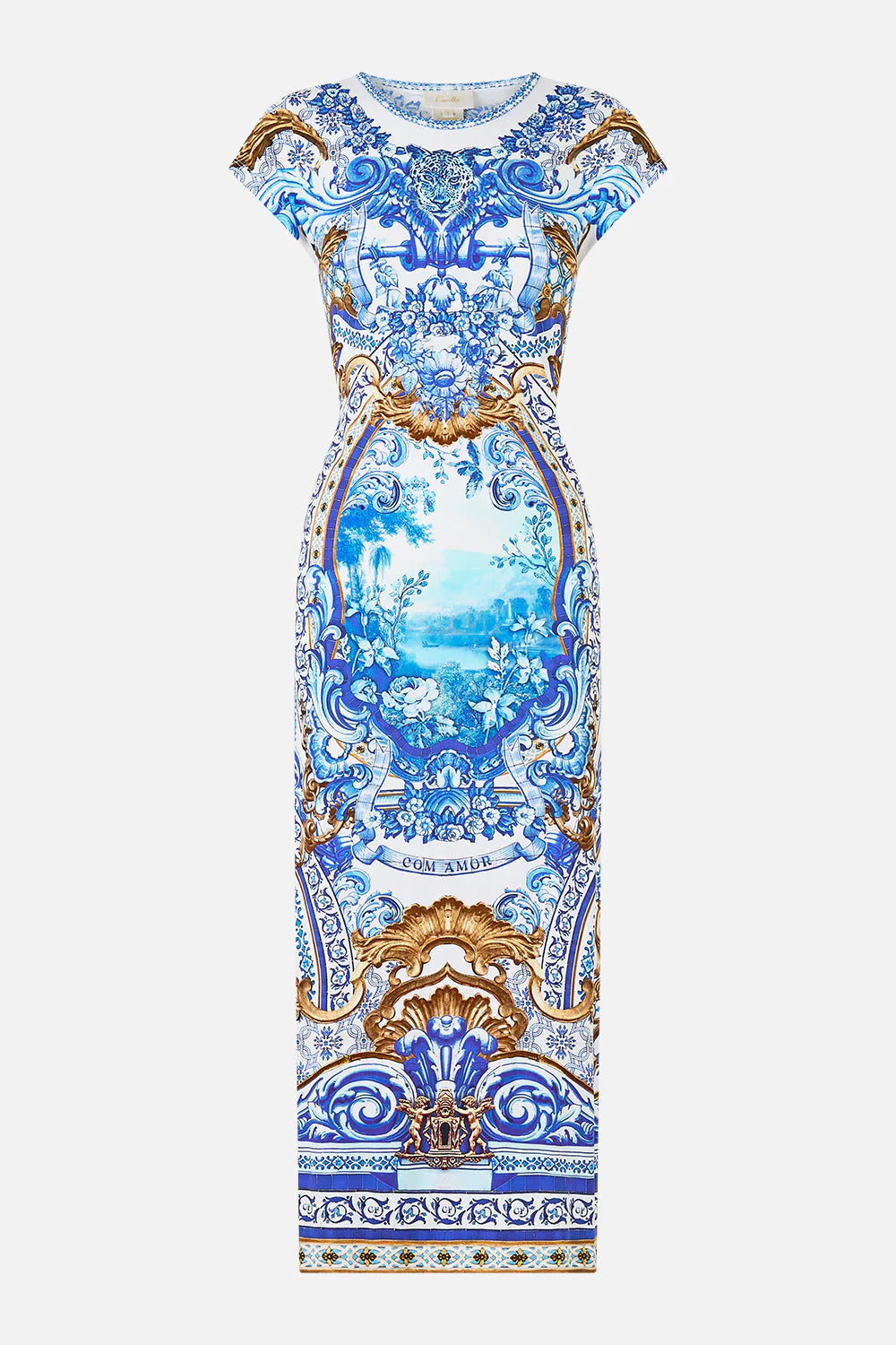 The Azul Adventures Jersey Tank Dress with Cap Sleeves echoes the rich blue and yellow hues of Queluz Palace's artwork, featuring hand-painted motifs and scenes of Portuguese life, a tribute to Leho tilework and ceramic storytelling. Lovingly handcrafted, this jersey dress embraces a fitted style that whispers of refined allure. Its long length drapes with quiet elegance, while the crew neck and cap sleeves reveal a subtle sophistication. A piece that exudes effortless luxury, designed to move with you through every moment.