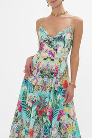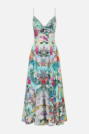 The Gardens Of Queluz Long Dress With Tie Front invites you into Queluz Palace, where vivid greens and lush florals blend with the elegance of Azulejo tiles, celebrating nature and artful design. Lovingly handcrafted, this luscious sundress features a fitted bodice with an adjustable tie front detail. The lowered waist seam flows into a circular flared skirt that dances at the ankles for romantic billow.