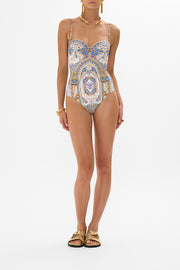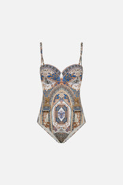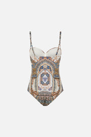 Designed in Australia, The Make Me Your Mosaic Underwire Cup One Piece evokes the breathtaking tessellations that adorn the sacred walls of Egypt's architectural masterpieces Lovingly handcrafted from luxurious ECONYL® regenerated nylon, this exquisite one-piece is designed for a D cup fit and features sumptuous underwire with foam cup support. It provides elegant regular bottom coverage and is adorned with sparkling crystal embellishments for a touch of opulence.