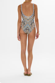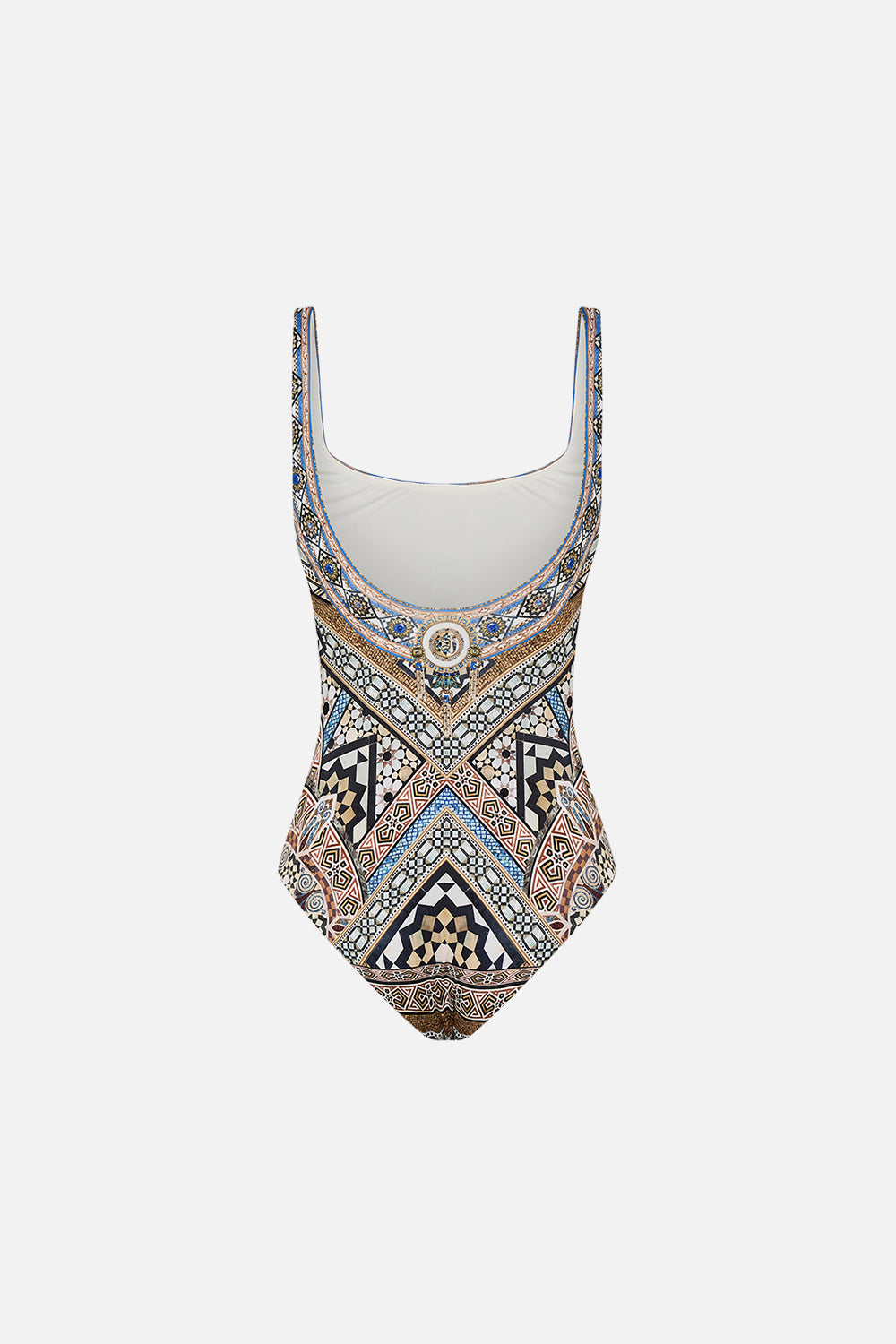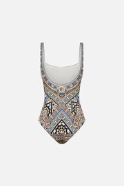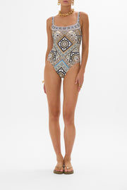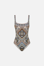 Designed in Australia, The Make Me Your Mosaic Underwire Square Neck One Piece evokes the breathtaking tessellations that adorn the sacred walls of Egypt's architectural masterpieces Lovingly handcrafted and designed for a D cup, this luxurious one-piece features underwire support and a chic square neckline. Crafted from ECONYL® regenerated nylon, it is adorned with sparkling crystal embellishments, blending sustainable elegance with opulent style.