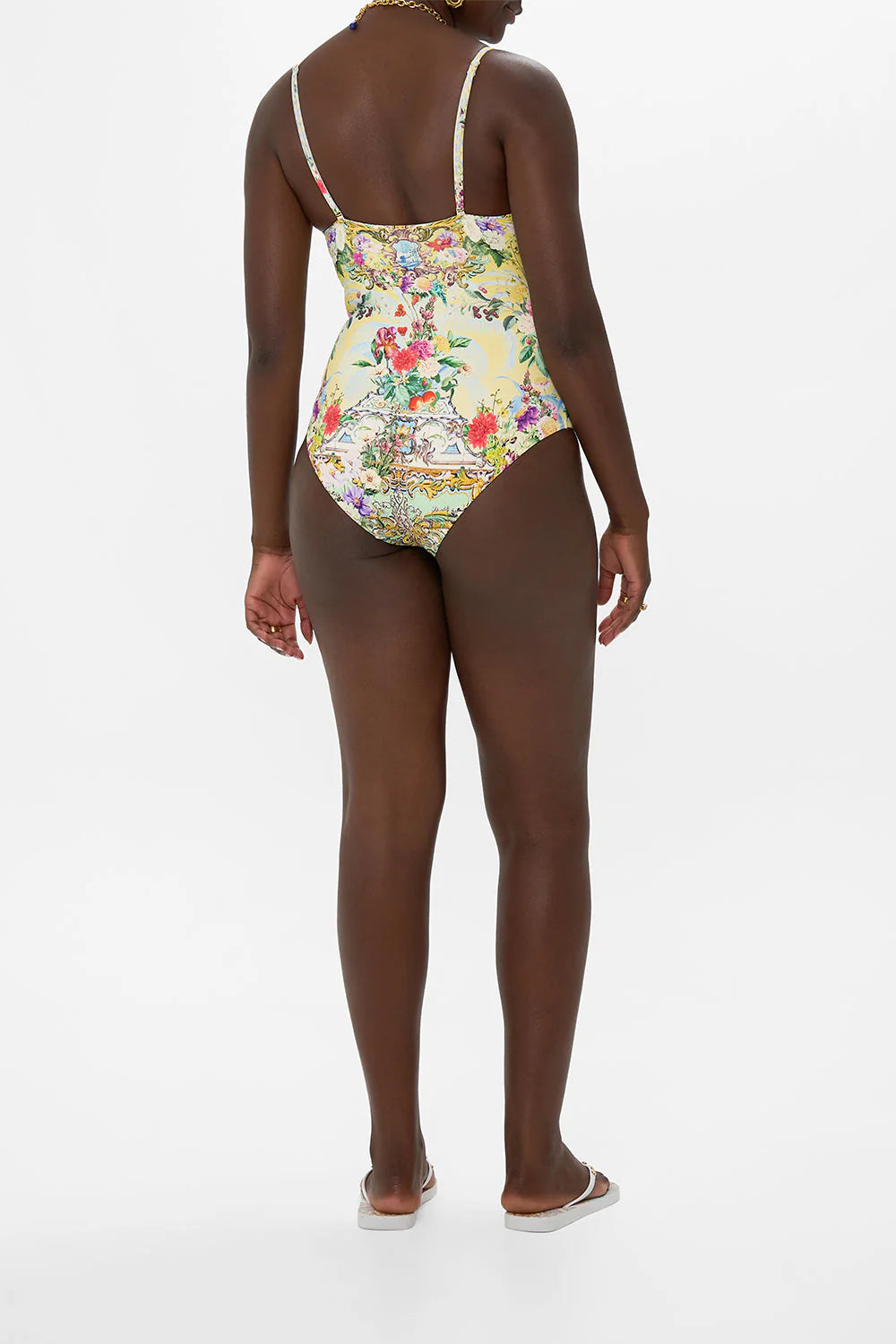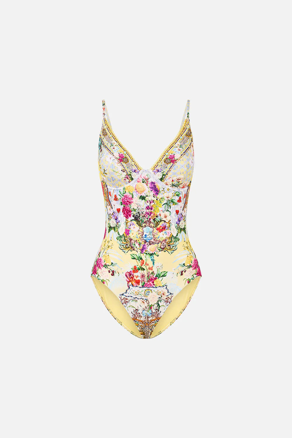 The Flor Fantástica Soft Cup Underwire One Piece echoes the splendor of Queluz Palace, soft yellow hues bloom amidst florals inspired by its lush gardens. A celebration of nature's elegance and timeless artistry. This swimsuit has been crafted to fit a C-D cup expertly, with removable soft cups and underwire support. CAMILLA crystals add summer worthy shine.
